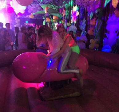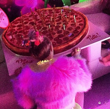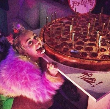 El pastel de Miley fue una pizza gigante y además en la fiesta había un toro mecánico en forma de pene, las fotos fueron compartidas en Instagram.