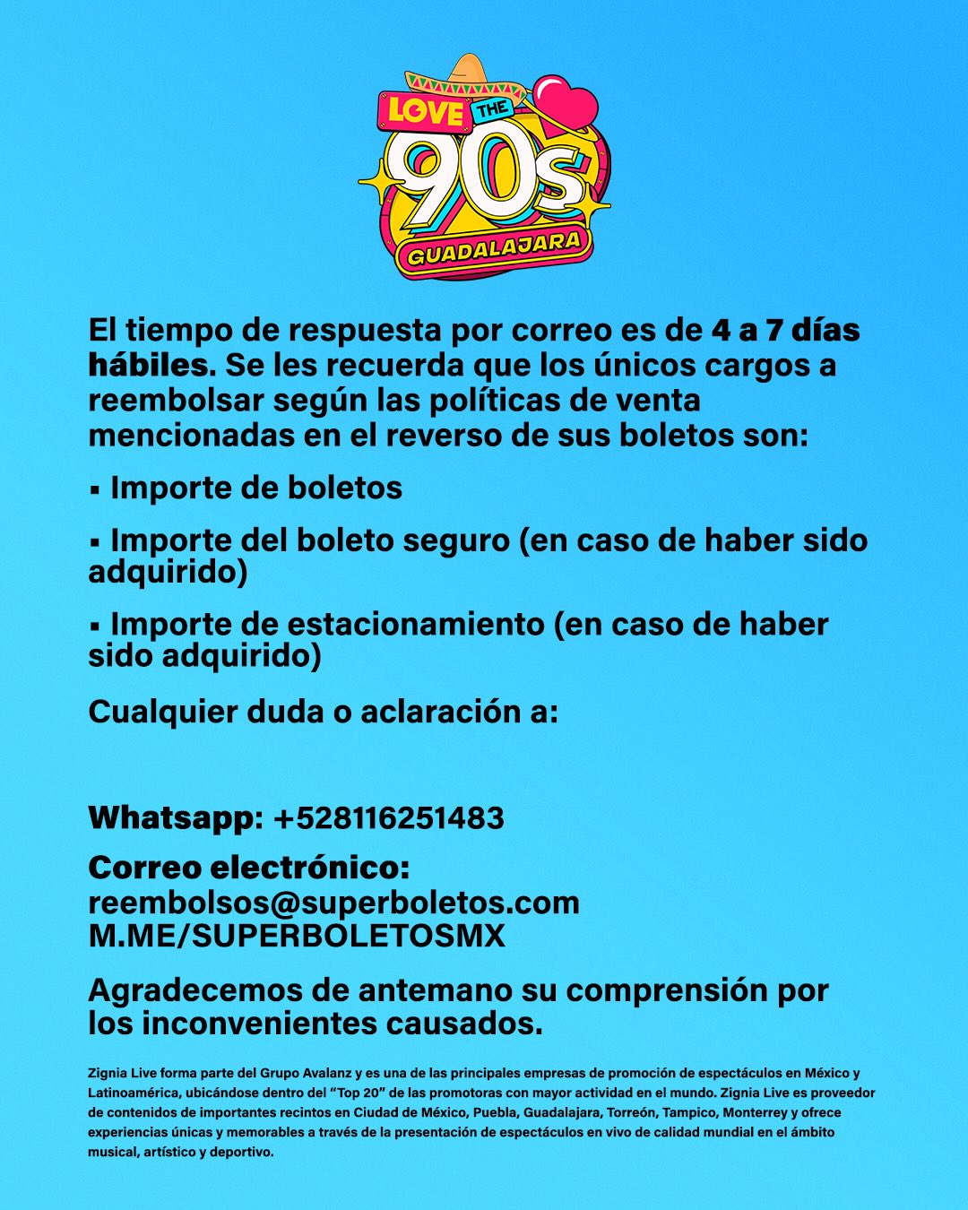 En cuanto a los boletos adquiridos para el festival «Love the 90s», se anunció que serán respetados para esa presentación, pero en caso de reembolso, los asistentes podrán solicitarlo a través de correo electrónico.
