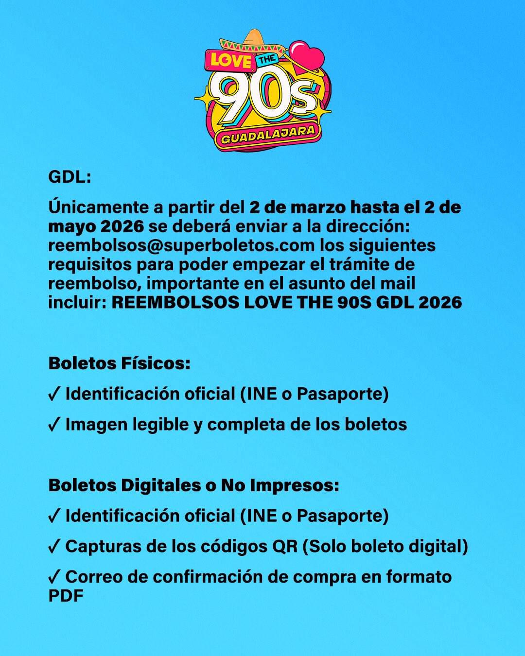 En cuanto a los boletos adquiridos para el festival «Love the 90s», se anunció que serán respetados para esa presentación, pero en caso de reembolso, los asistentes podrán solicitarlo a través de correo electrónico.